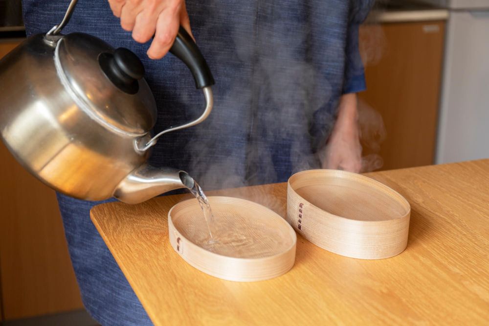 Rinse with lukewarm water after each use, wipe dry, and air-dry fully in a shaded spot before storing. Use a soft sponge and a small amount of mild diluted detergent for oily residue. Never soak, bleach, or put in the dishwasher or microwave. The inside may gradually darken with use. This is a natural reaction between rice starch and cedar tannins, and is completely harmless.
