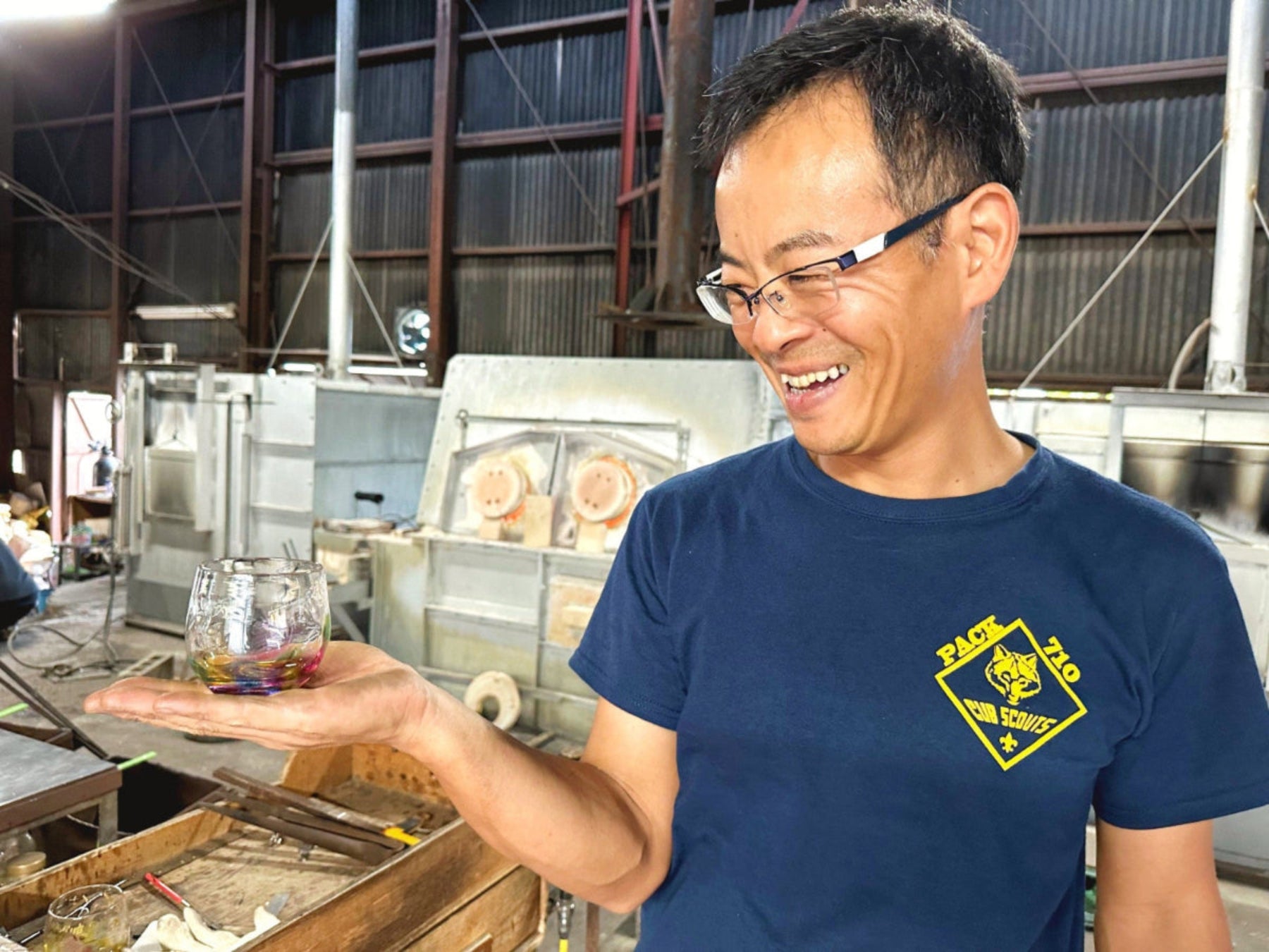 Because of this, and waves of mechanization and automation, not only the very special 'Jappan' blowing technique, using two long thin tubes to mold glass mid-air, but all glass blowing techniques altogether have been in decline. The Soejima Glassware kiln sees the immense value in this tradition, and keeps working in preserving it for future generations.